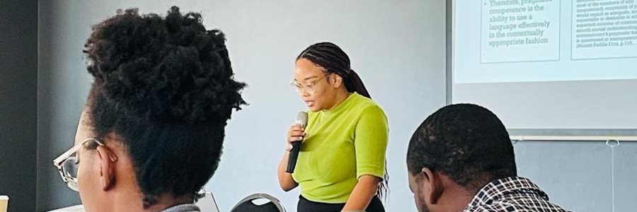 Presentations from Nelson Mandela University included a discussion on pedagogy with Mukhtar Raban, an Epistemic injustice research proposal by Angelique Ludick, an MA student from the LALs department, and a demonstration on text readability by Johannes Sibeko.